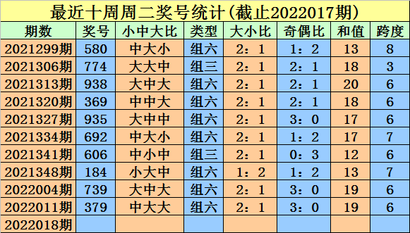 上期回顾:福彩3D第2022017期奖号为:348,其中奖号组选类型为:组六,奇偶比为1:2,大小比为1:2,012路比为1:1:1,和值为15,跨度为5。