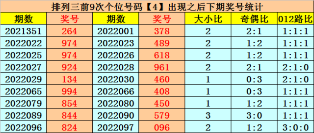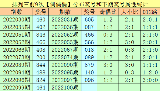 在最近9期开出奇偶分布:偶偶偶的奖号为:460-402-846-466-408-200-844-488-824,在下期出现号码分别为:605-087-466-566-013-089-579-140-096。其中百十个位号码分布情况如下: