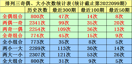 排列三第2022099期奖号为464,直选奇偶分布为:偶偶偶,该奇偶分布历史上共出现了800次,前100期出现14次。