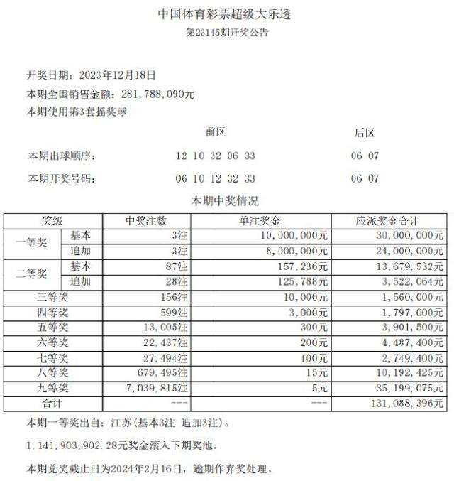 北京时间12月18日晚,体彩大乐透第23145期开奖,当期开奖号码为前区06 10 12 32 33,后区06 07;本期大乐透全国销量为2。81亿元,计奖结束后奖池余额11。41亿元。