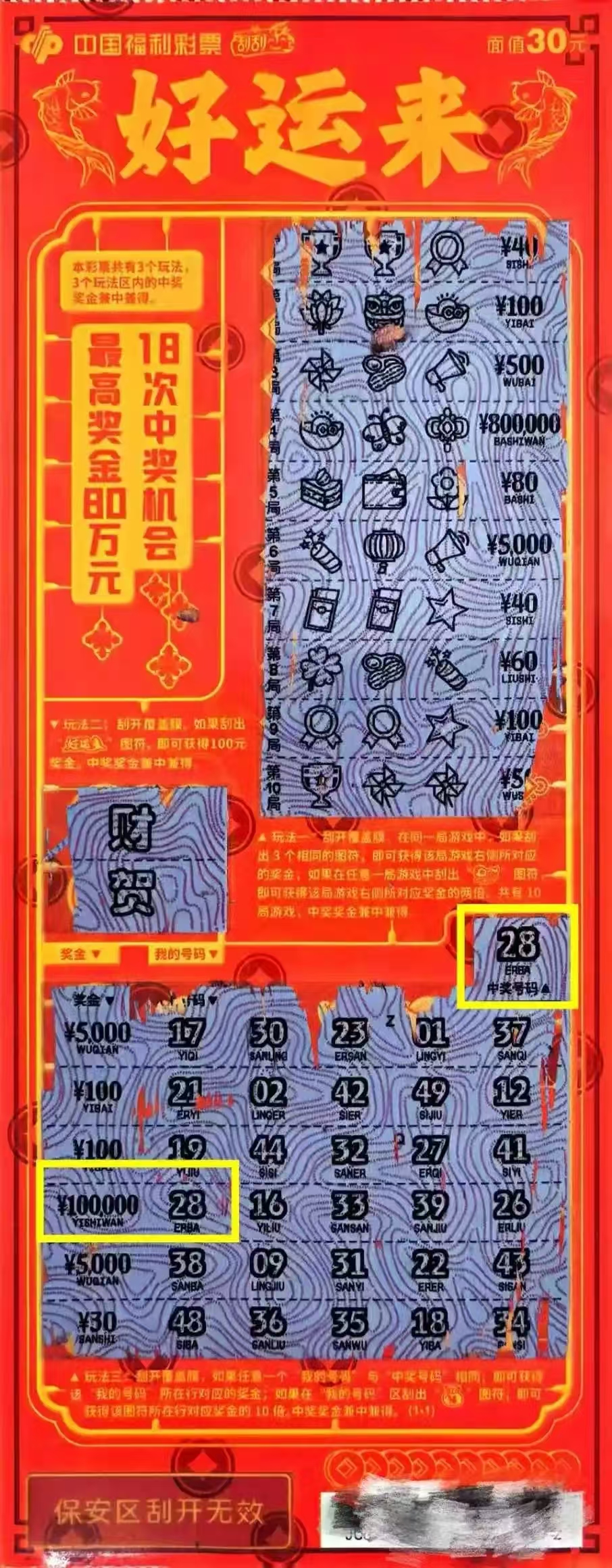 作为福彩刮刮乐家族的高端产品,30元面值的"好运来"设置了11个奖级,单张彩票提供多达18次中奖机会。其最大的特色在于创新性地融合了三种各具特色的玩法,真正实现了"一票多玩"的乐趣:玩法一采取三图符匹配机制,配合令人惊喜的加倍奖励;玩法二设置简单直观的指定图符中奖;玩法三则通过10倍奖金机制带来意外之喜。三种玩法区域的奖金可累计获取,最高奖金可达80万元,为购彩者创造了更多收获惊喜的可能。