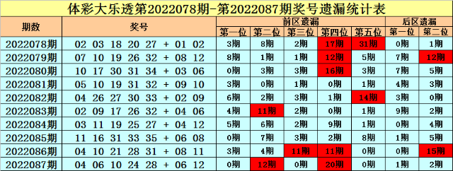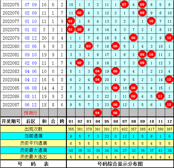 上期回顾:大乐透第2022087期奖号为:04 06 10 24 28 + 06 12,各位号码遗漏期数分别为:0期、12期、0期、20期、0期+1期、2期,前区遗漏总值为32期,后区遗漏总值为3期。
