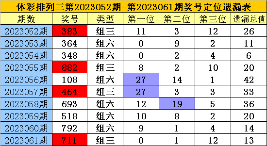开奖回顾:排列三第2023061期奖号为:711,各位号码遗漏值分别为0、1、12,遗漏总值为13。