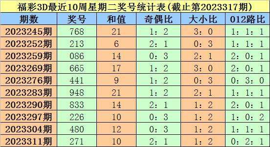 福彩3D第2023311期(上周星期二)奖号为271。其中奖号奇偶比为2:1,大小比为1:2,012路比为0:2:1。