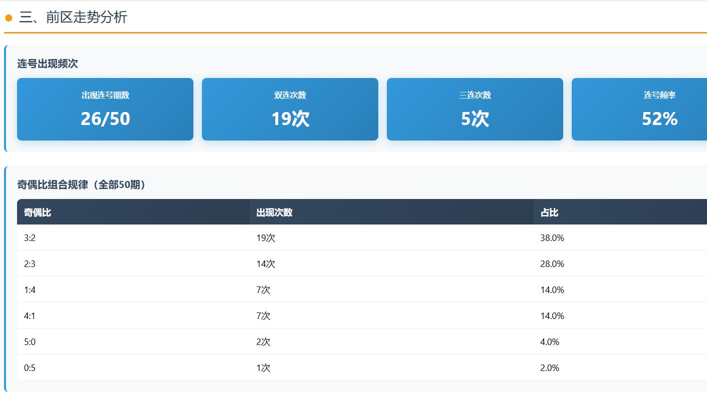 连号方面,50期中有26期出现,占比52%。其中双连19次,三连5次。这个数据已经很直白了——连号不是偶发,而是常态。尤其是在某一段时间内,连号甚至会形成“惯性”。