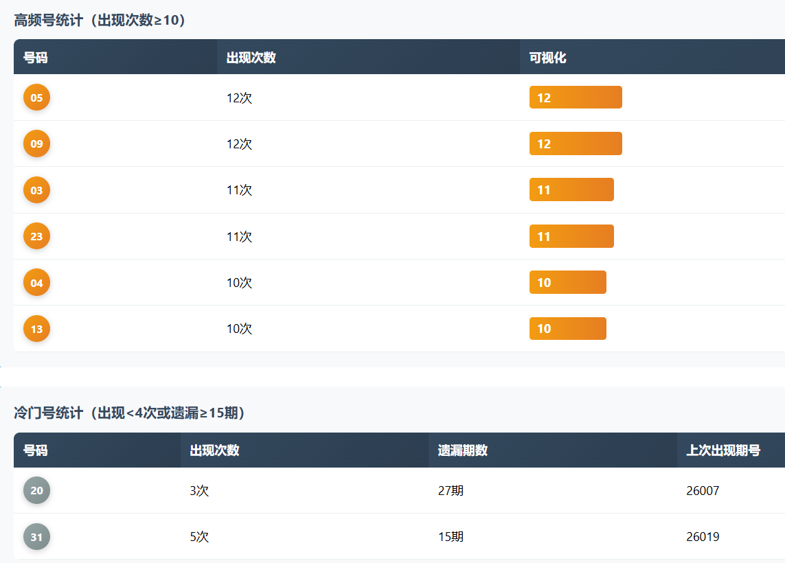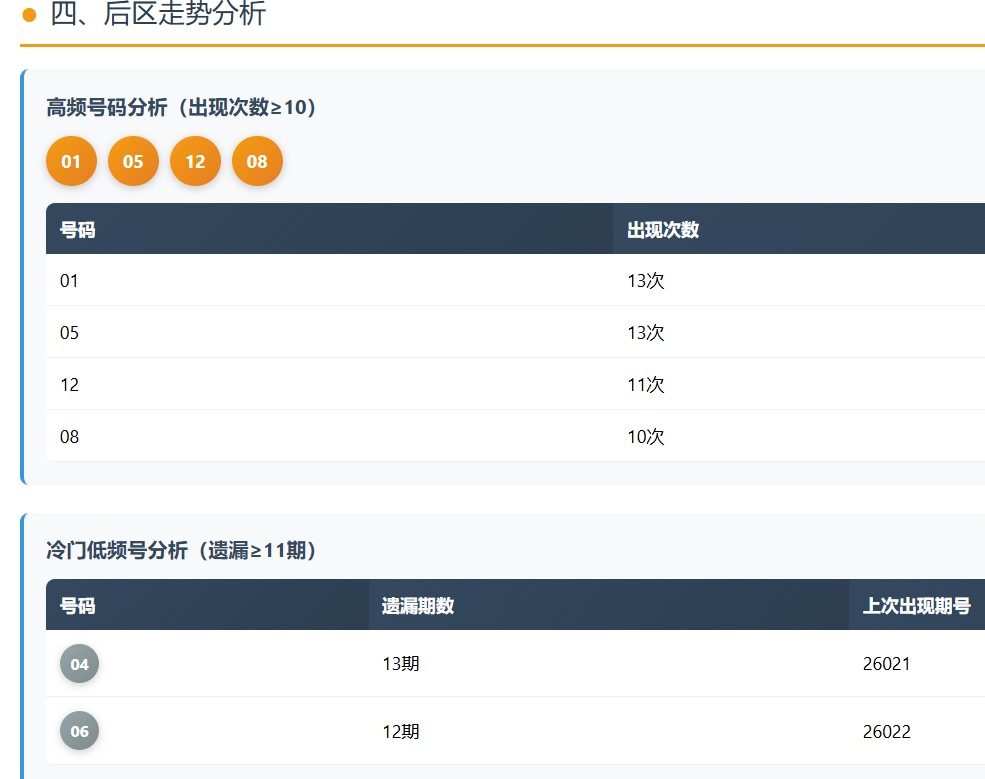 01、05、12、08为高频号码,其中01和05各出现13次,是绝对主力。