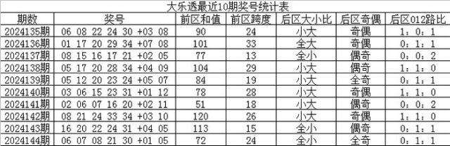 体彩大乐透第24144期开出奖号:06 07 08 21 30 + 01 05,其中,前区奖号首尾间距为24,和值为72,奇偶比为2:3,012路比为3:1:1,大小比为2:3。