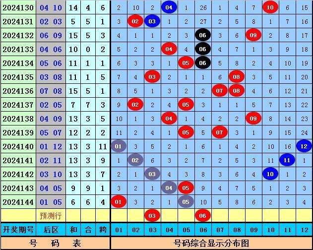 三、后区奖号分析:最近十期后区分别开出奖号:03+08、07+08、02+05、04+09、05+07、01+12、02+11、03+10、04+05、01+05,其中后区号码012路比为4:7:9,奇偶比为12:8,大小比为7:12,本期后区排除2路号码,看好号码01、03、06、07、10。