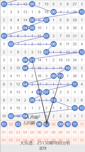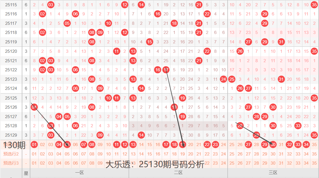 通过上期号码的简单分析,我们看下25130期红色号码球的总体走势,如下图:
