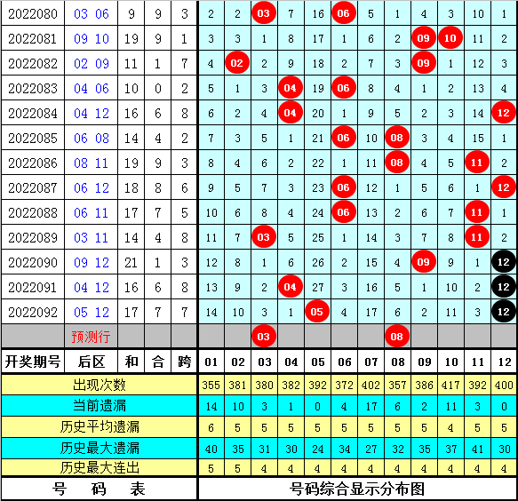 后区分析:上期后区奖号为05+12,本期后区排除重号,四码参考02、03、04、08。