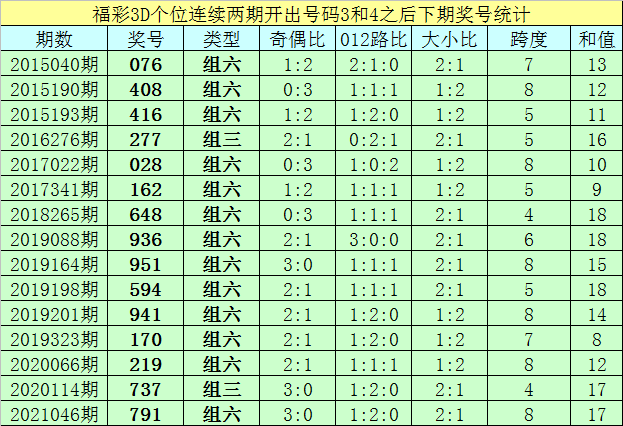 个位号码:最近两期个位开出号码为3-4,在福彩3D历史开奖中,前后两期个位分别开出号码3-4的奖号出现了75次。最近15期个位3-4组合出现之后,其下期奖号分别为:076-408-416-277-028-162-648-936-951-594-941-170-219-737-791;