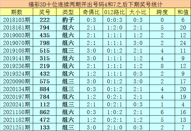 十位号码:前两期十位分别出现奖号4-7,历史上福彩3D连续前后分别开出号码4-7的现象共开出86次。在十位4-7的现象出现时,最近15期其下期分别开出号码:222-794-435-798-515-315-219-432-575-884-784-112-862-472-133;