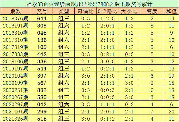 百位号码:连续两期百位出号分别为:7-8,历史上福彩3D连续两期前后分别出号7-8的奖号共出现81次。在百位7-8的奖号现象出现时,近15期下期分别出号:644-308-045-136-105-442-336-544-397-567-882-585-042-299-515;