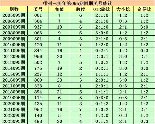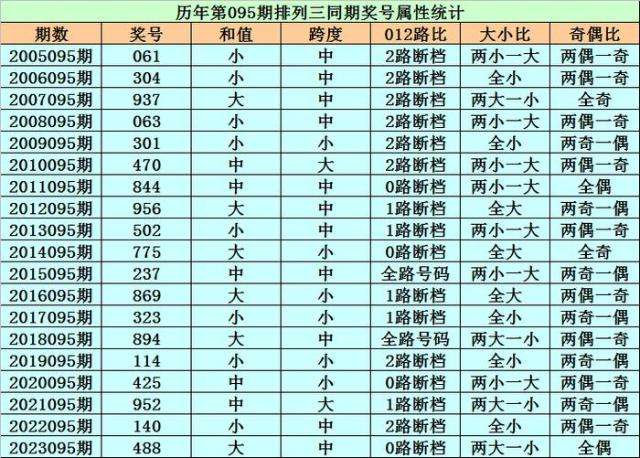 历史上第2024095期排列三已开出19期奖号了,历年同期奖号分别为:061、304、937、063、301、470、844、956、502、775、237、869、323、894、114、425、952、140、488,详细统计见下表: