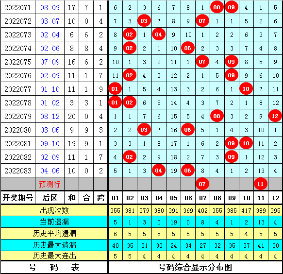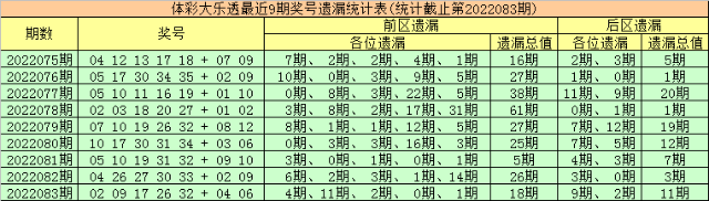 上期回顾:体彩大乐透第2022083期开出奖号为:02 09 17 26 32 + 04 06,其中前区各位奖号分别遗漏:4期、11期、2期、0期和1期,遗漏总值为18期,后区号码分别遗漏9期和2期,遗漏总值为11期。