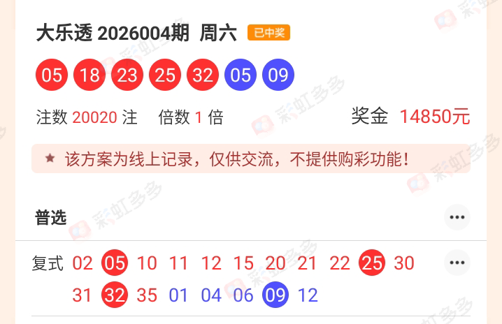 26004期大乐透开奖号码为5 18 23 25 32 + 5 9,以下是总结