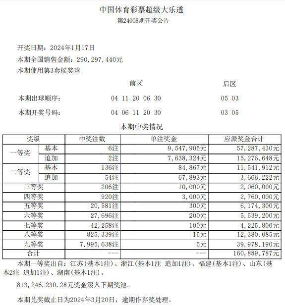北京时间1月17日晚,体彩大乐透第24008期开奖,当期开奖号码为前区04 06 11 20 30 ,后区03 05;本期全国销量为2。90亿元,计奖结束后奖池余额8。13亿元。
