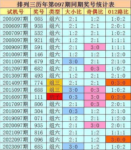 奇偶分析:历史上排列三第097期同期奖号中,奇偶比0:3、3:0出现3期,奇偶比1:2出现6期,奇偶比2:1出现7期,奇偶奖号总比例开出29:28,奇偶号码出现比例基本相当,今年第097期看好奇数热出,关注奇偶比2:1。