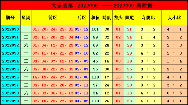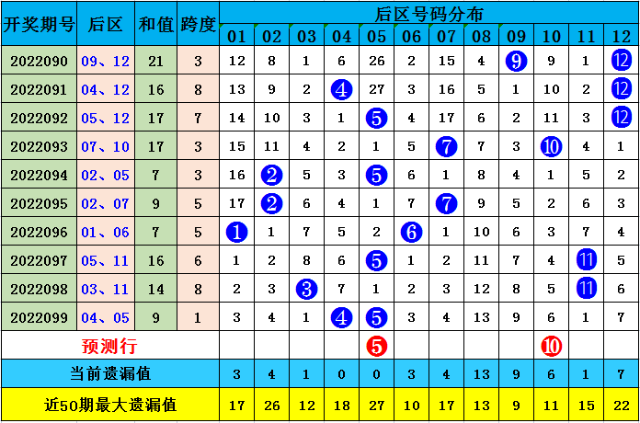 后区分析:上期后区奖号04、05。为小小偶奇组合,和值9,跨度1。近10期后区和值在7-21之间开出,和值奇偶比为7:3,预计本期和值为15;近10期后区奇偶比为11:9,预计本期奇偶组合热出;近10期后区跨度在1-8之间,跨度奇偶比为7:3,预计本期跨度为5。后区两码综合推荐05、10。