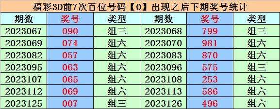 在百位号码0前7次开出之后,其下期分别开出号码:7、9、8、5、2、5、4,其中号码奇偶比为4:3,大小比为5:2,012路比为1:2:4。