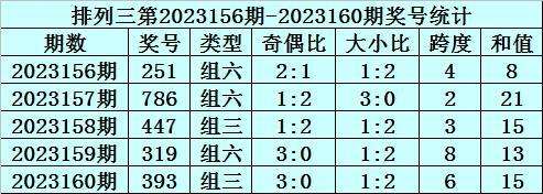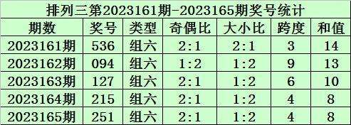 上期回顾:排列三第2023165期开奖号码为251。奖号类型为组六,奇偶比为2:1,大小比为1:2,跨度为4,和值为8。