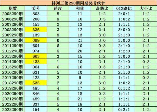 号码大小比:第291期历史同期奖号大小比为24:30,其中大小比0:3开出4期,1:2开出6期,2:1开出6期,3:0开出2期,本期参考大小比2:1。