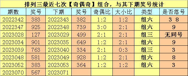 奇偶分析:排列三上期奖号为567,其奇偶类型为【奇偶奇】,最近七次出现奇偶类型奇偶奇的号码分别为:383、925、127、901、763、581、383,其下期奖号分别为:383、925、127、901、763、581、383。其中号码奇偶比为11:10,奇偶奖号开出比例基本平衡,本期看好偶数号码转热,注意奇偶比1:2出现。