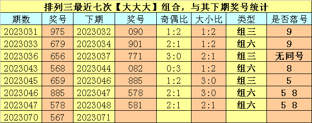 开奖回顾:排列三第2023070期开奖号码为:567。奖号类型为:组六,大小类型为:大大大,奇偶类型为:奇偶奇,无重号。