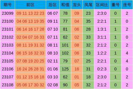 当期前区号码大小比为2:3,三区比为2:1:2,奇偶比为2:3,龙头开出05,凤尾开出32,无重号,开出1组连号05,06。后区开出”偶偶“形态的号码02、08。
