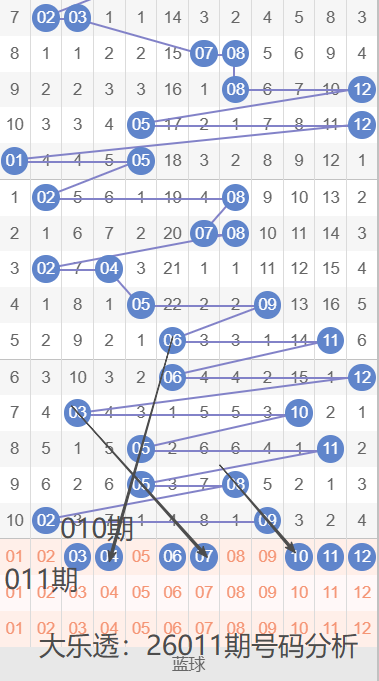 通过上期号码的简单分析,我们看下26011期红色号码球的总体走势,如下图: