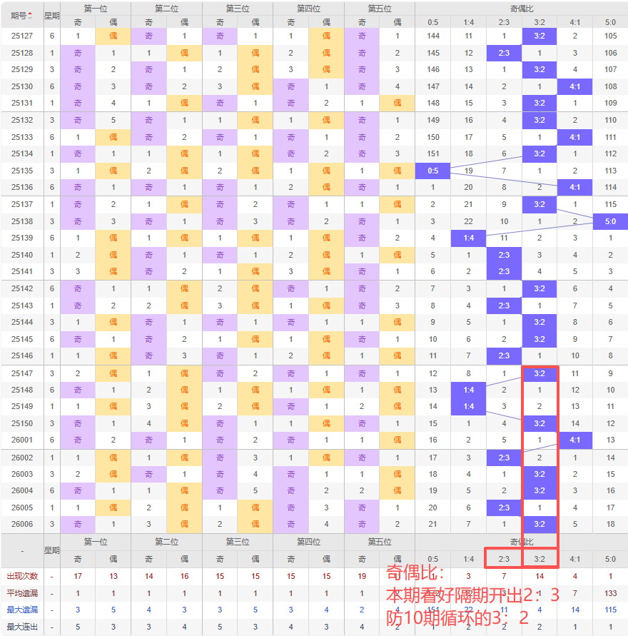 上期奇偶比:3:2,近10期奇偶比出现情况:3:2、1:4、1:4、3:2、4:1、2:3、3:2、3:2、2:3、3:2,最近10期出现5期3:2,出现2期2:3,出现1期4:1,出现2期1:4,出现0期5:0,出现0期0:5,根据近10期规律本期看好隔期出3:2,防10期循环的3:2,综上所述推荐奇偶比推荐:3:2,重点关注:2:3。