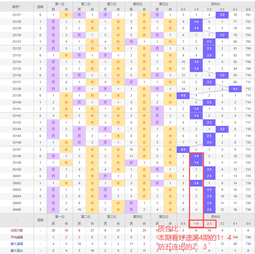 上期质合比:2:3,近10期质合比出现情况0:5、1:4、1:4、2:3、2:3、1:4、2:3、2:3、2:3、2:3,最近10期出现0期3:2,出现6期2:3,出现0期4:1,出现3期1:4,出现0期5:0,出现1期0:5,根据近10期规律本期看好遗漏4期的1:4,防五连出2:3,综上所述推荐质合比推荐:2:3,重点关注:1:4。