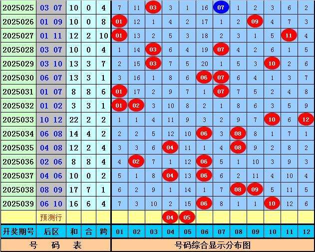 后区上期开出奖号06和10,该组合历史上出现了43次,其下期奖号频次分别为:号码07、08出现10次,03、11出现8次,01、02、05、12出现7次,06、09出现6次,04、10出现4次,本期后区参考号码02、04、05、07,精选两码04和05。
