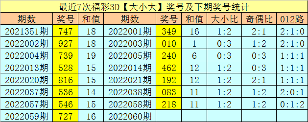 开奖回顾:福彩3D第2022059期奖号为727。奖号为:组三,大小比为2:1,大小类型为:大小大。