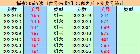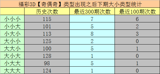 二、最近7次【大小大】奖号之后,其下期分别开出号码:349、010、240、462、192、083、218,其中组三号码出现1次,组六号码出现6次。本期预计开出组六号码。