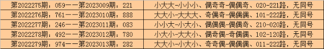 所以,排列三第2022280期奖号:133,与排列三第2023014期奖号可能没有同号。且排列三第2023014期奖号大小比、奇偶比和012路比不会与第2022280期奖号直选形态:小小小、奇奇奇和100路全部相同。