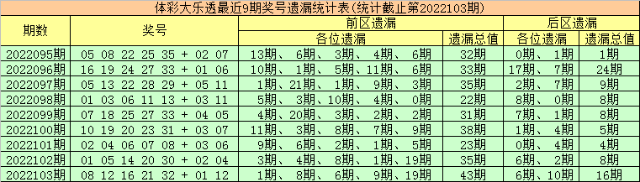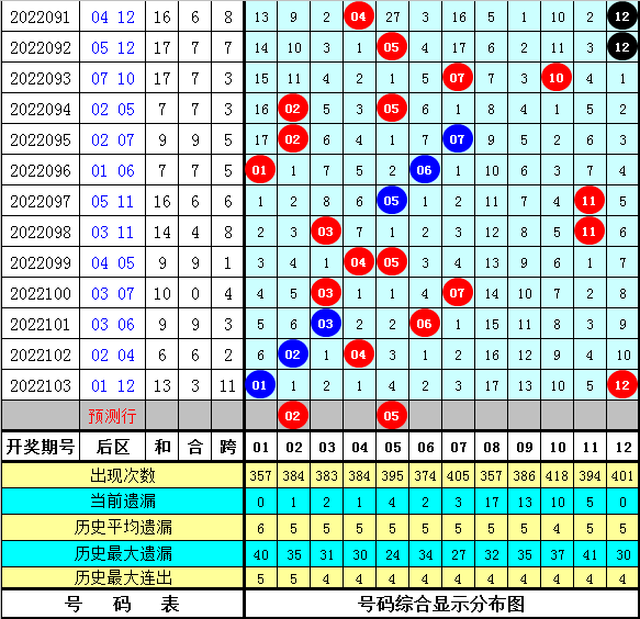 上期回顾:体彩大乐透第2022103期开出奖号为:08 12 16 21 32 + 01 12,其中前区各位奖号分别遗漏:1期、8期、6期、9期和19期,遗漏总值为43期,后区号码分别遗漏6期和10期,遗漏总值为16期。