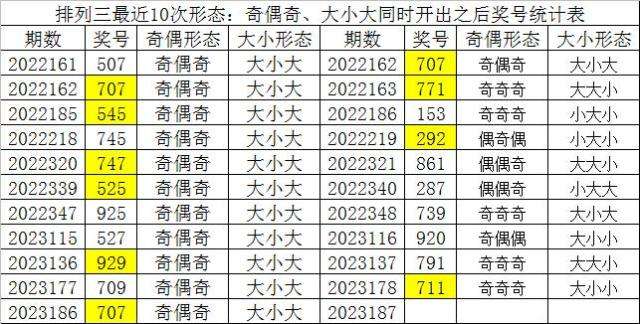 排列三最近10次同时开出奇偶形态:奇偶奇和大小形态:大小大时其奖号分别为:507-707-545-745-747-525-925-527-929-709-707,下期分别开出号码为:707-771-153-292-861-287-739-920-791-711,详细统计见下表:
