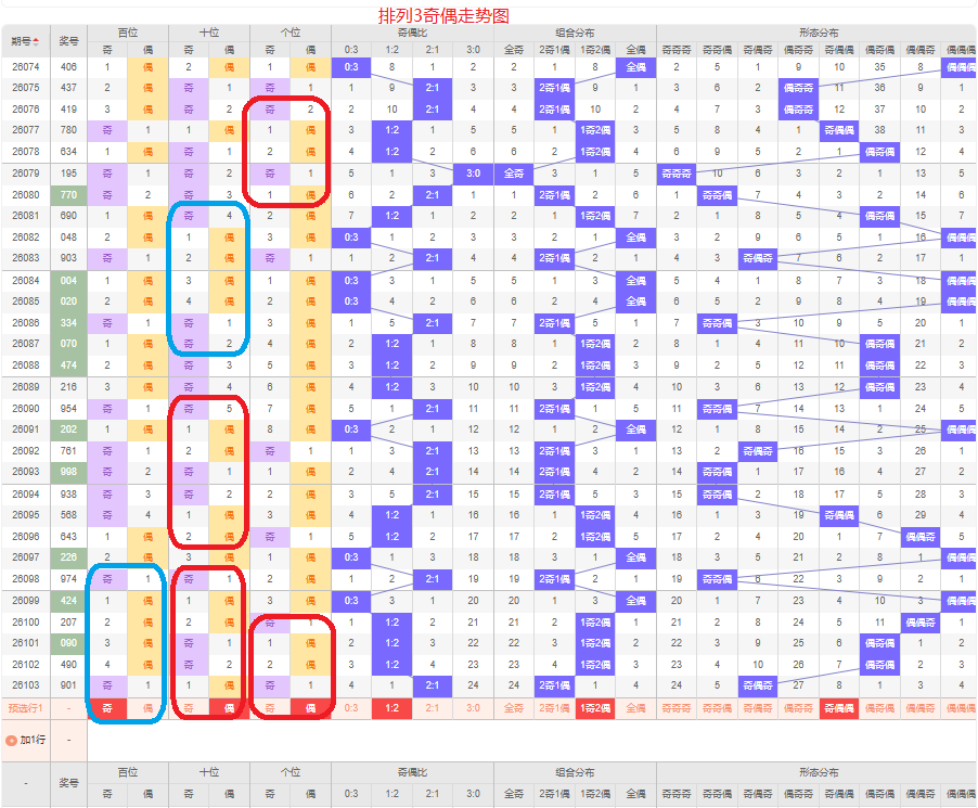 上一期的奇偶比为2:1,两奇的号码组合,从近五期的奇偶数出现情况看,奇数出5次,偶数出现10次,奇数号码出现较少,本期要侧重两偶的号码组合,侧重奇偶偶或奇奇偶的号码组合,根据奇偶组合形态可做五码定位13579/02468/02468或13579/13579/02468