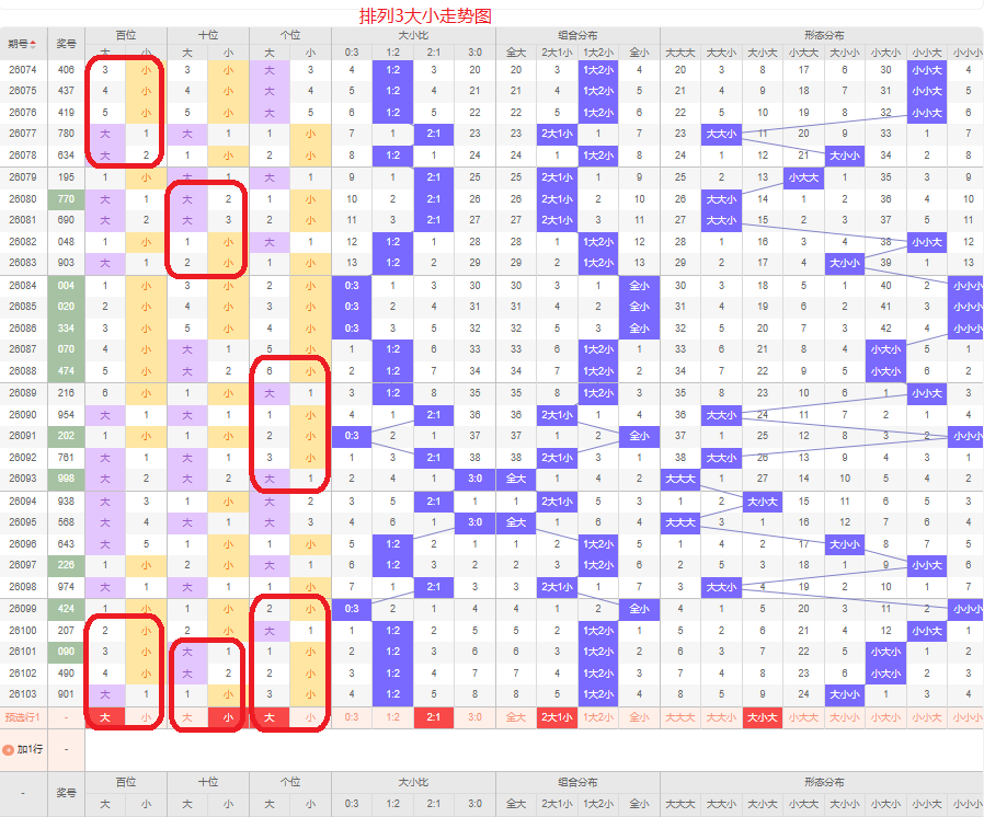 上一期大小比为1:2,两小的号码组合,近五期大号出4次,小号出11次,大号码出现较少,上一期是两小的号码组合,本期侧重两大的号码组合,百位侧重大号码,十位侧重小号码,个位侧重大号码,侧重大小大或者大大小的号码组合,根据大小形态五码定位56789/01234/56789或者56789/56789/01234