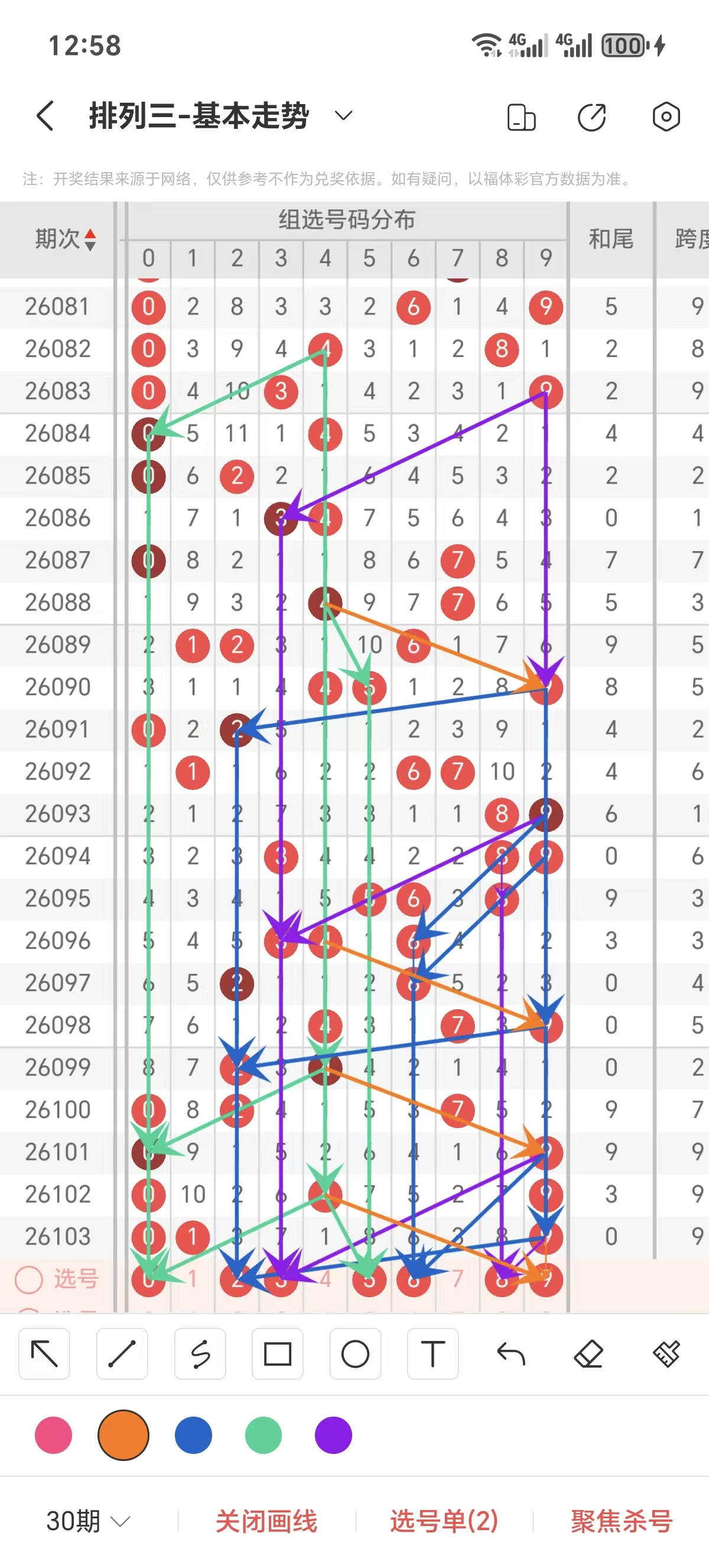 通常情况下在五期之内重复一个跨度的概率较高,近五期重复了9的跨度,近五期跨度为2/7/9/9/9,近期0路的跨度较热,本期要侧重3/5/7跨为主的号码组合。选择好跨度就可以从跨度方面选择相应的双胆码组合,双胆码的选取要根据近期和历史的走势进一步的分析选取。