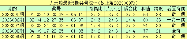 开奖回顾:体彩大乐透第23009期奖号为:01 05 11 15 33+01 10,前区奇偶比为5:0,大小比为1:4,和值为65,跨度为32,后区开出一奇一偶组合。