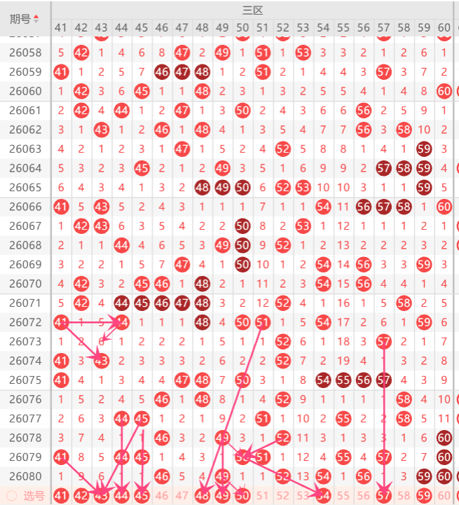 而三区的打底号是41.44.45.49.50.51.55.57.中参考3-4码开出机会,