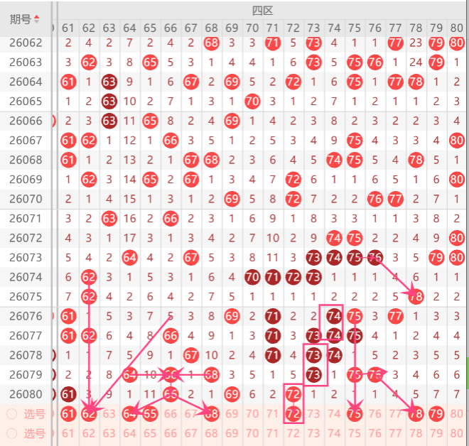 四区在近期的走势上来判断机会的话,整体区间开出走热形态,上期四区间开出了4码,而且上期区间开出的形态是重码和对称形态走势,上期小妹在文章中布局到了2码开出,那么本期四区间我们重点关注的形态是隔期回补,重码走势,空位回补,那么本期首先注意隔期回补上的64.68.75中选择一码回补机会,而重码走势上注意61.66.72中选择一码走重机会,至于空位回补上防守62.63.78.79中参考1-2码回补机会,上期重点关注在重码走势上布局到了1码开出,那么本期重点关注在隔期回补上布局一码订胆机会,如图所示