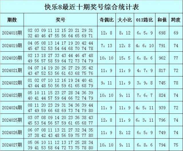 福彩快乐8第2024027期开出奖号:05 06 10 11 12 13 17 25 28 34 39 41 53 58 64 72 73 75 78 80,其中奖号奇偶比开出10:10,大小比开出9:11,和值开出794,跨度开出75,012路比开出6:8:6。