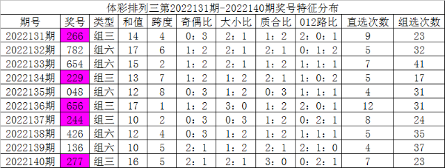 开奖公告:体彩排列三第2022140期开出奖号:277。组三,无重号,奇偶比2:1,大小比2:1,012比0:2:1,和值16,跨度5。
