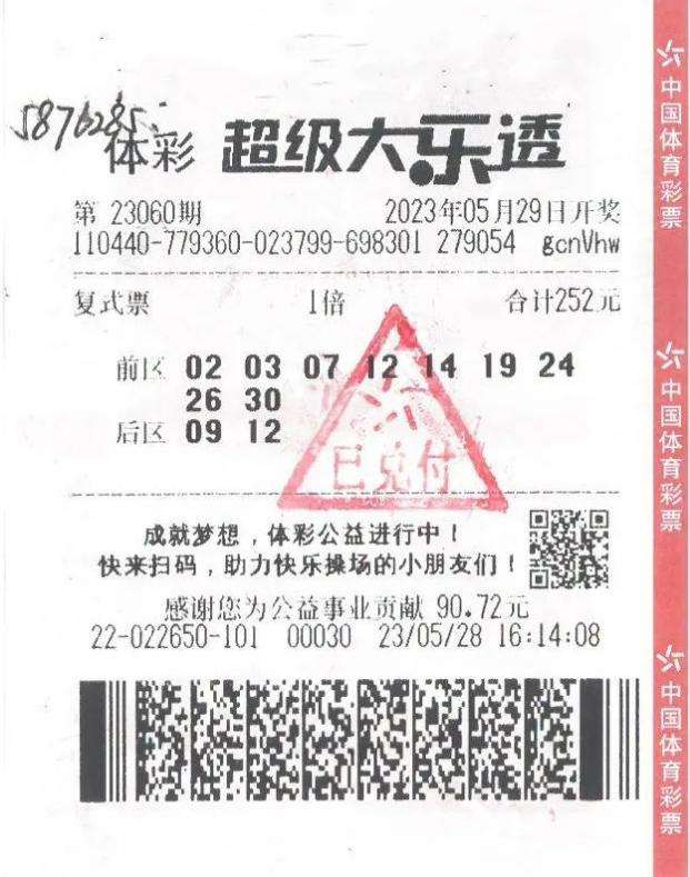 新快报讯 记者陆妍思 通讯员梁一鸣报道 近日,江门蓬江区大奖中奖彩民王先生(化姓)独自一人来到江门市福利彩票发行中心办理兑奖手续。第23063期双色球开奖中,他在蓬江区白沙永盛一街24号106的44120314投注站购买了两张彩票,第一张是10元的“6+5”复式票,中得1注1000万元一等奖、4注16万多元二等奖。第二张是18元的3注单式3倍票,中得二等奖3注、三等奖3注。王先生总共中得1118万多元,成为江门市2023年中国福利彩票首个千万元大奖。