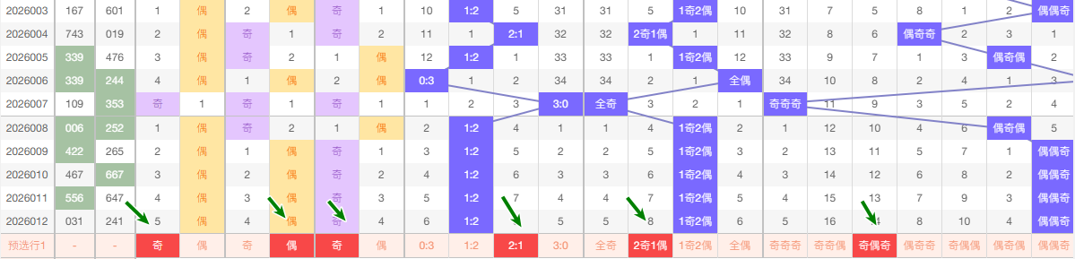 (二)、奇偶分析 奇数 13579 偶数 02468 在这5期 数据中 奇数出现5次 偶数出现 10次 从昨天出号来看偶数占优, 本期还是看好偶数有号 看好 奇偶奇 奇奇奇