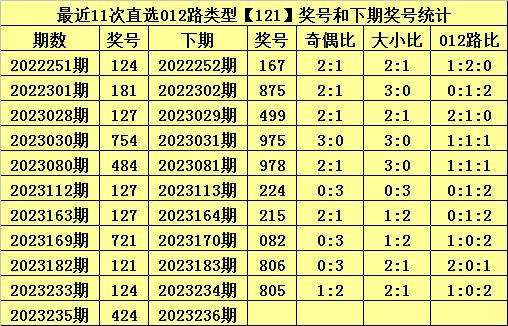 排列三上期开出奖号为:424,其直选012路类型为121,历史上直选121号码已开出了204次,最近11期分别开出奖号为:124、181、127、754、484、127、127、721、121、124、424。