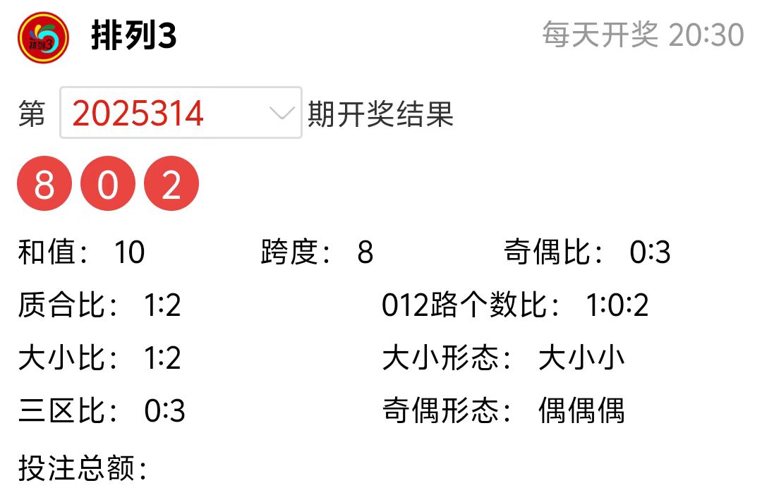 排列3上期开三个偶数8、0、2,跨度:8,和值:10,奇偶比:0:3,质合比:1:2,大小形态:大小小,三区比:0:3, 012路个数比:1:0:2